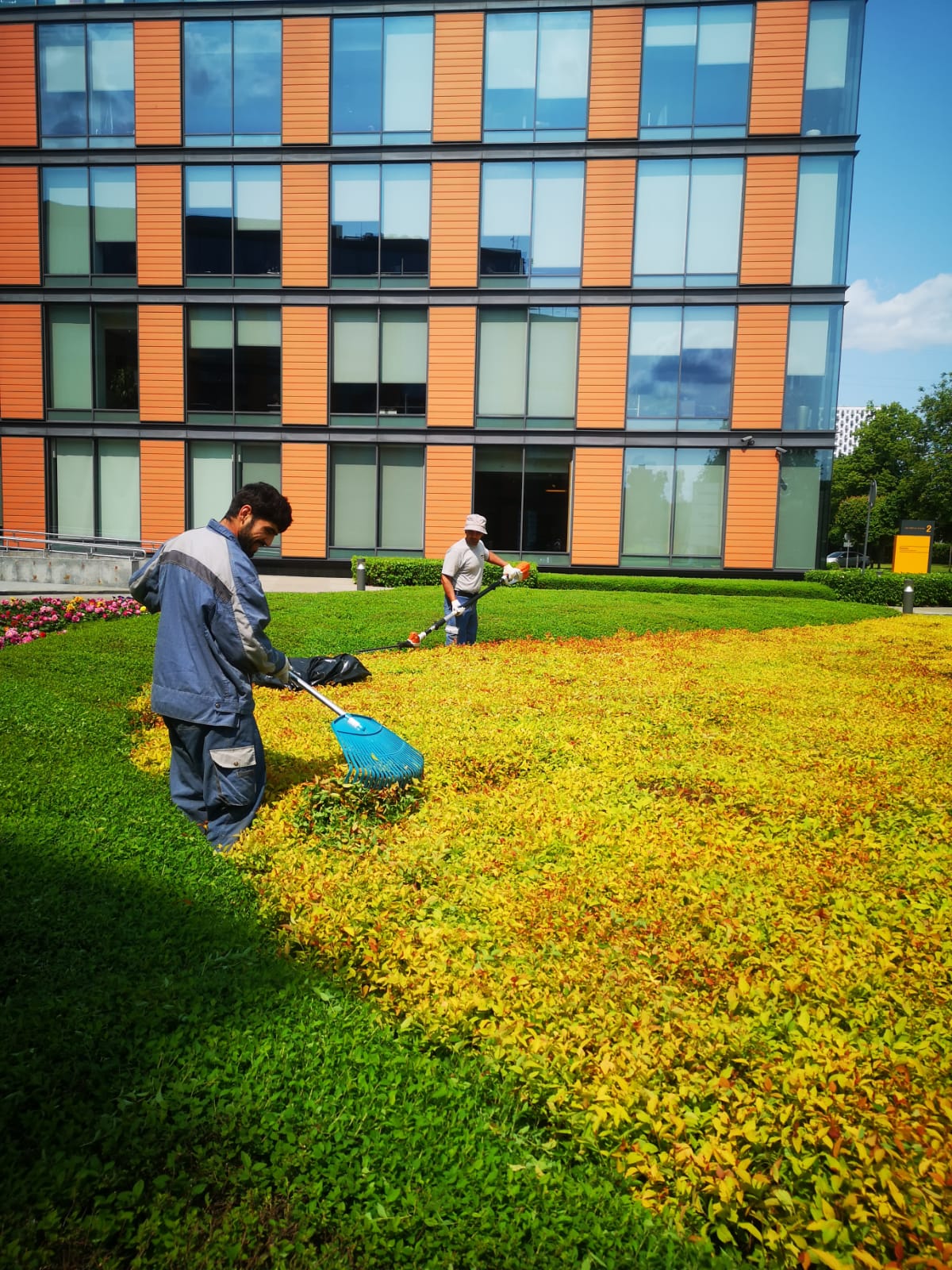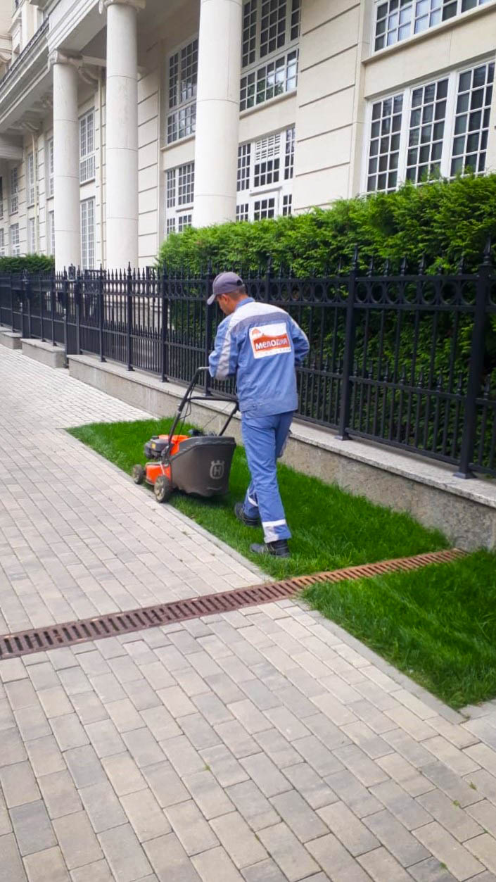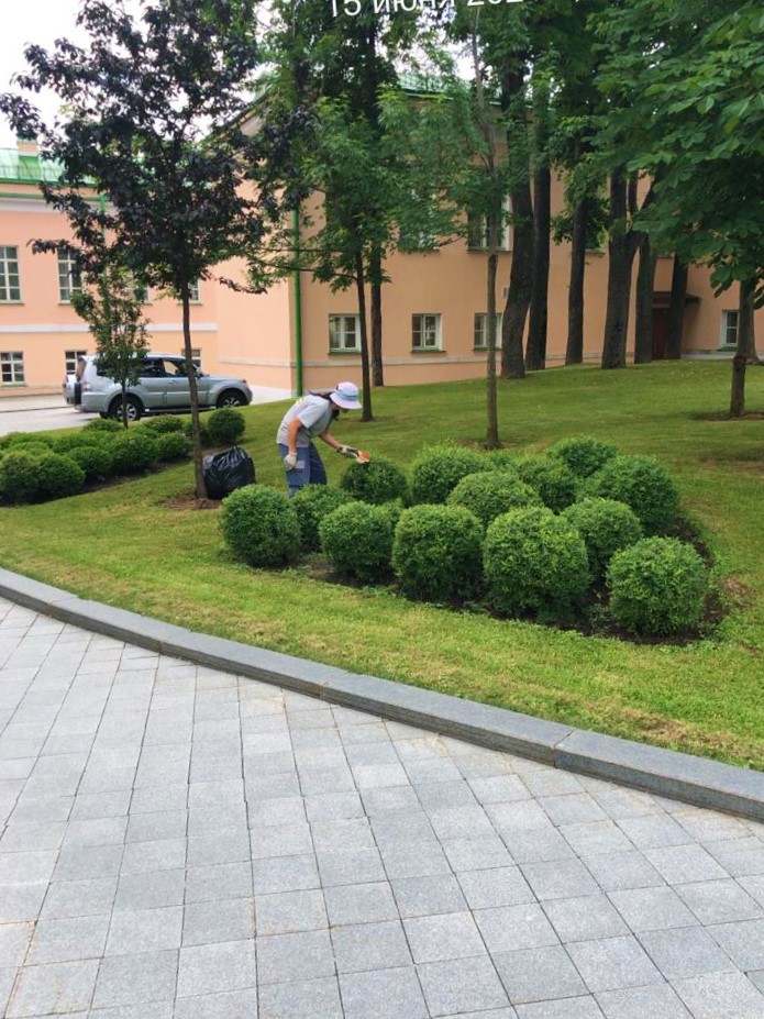 С мая по октябрь регулярно выполняются с разной кратностью следующие виды работ: стрижка и подкормка газона, формовочная стрижка растений, рыхление приствольных лунок, прополка цветников, мониторинг увлажнения почвы, регулировка полива с учётом охвата всех зон.