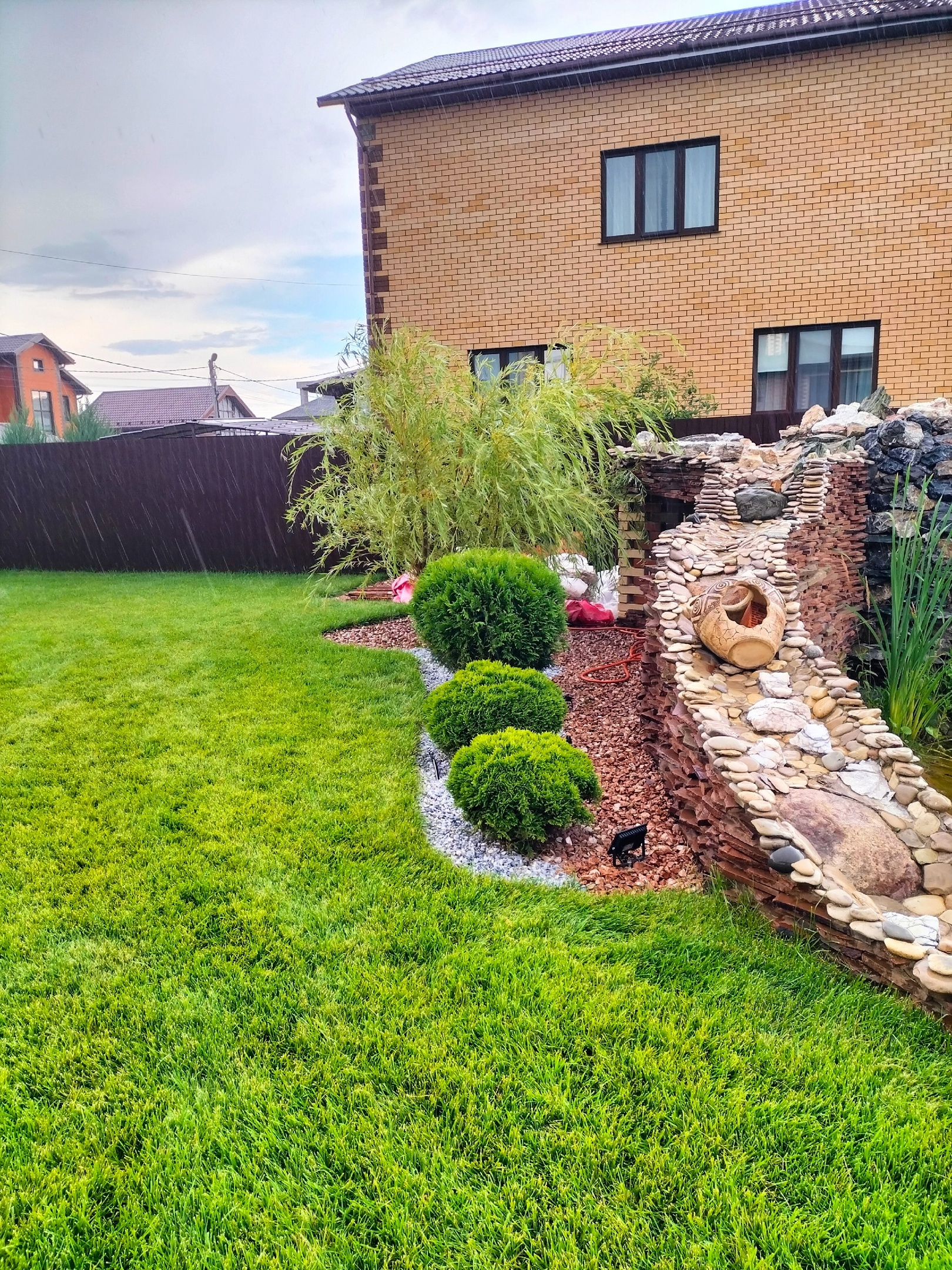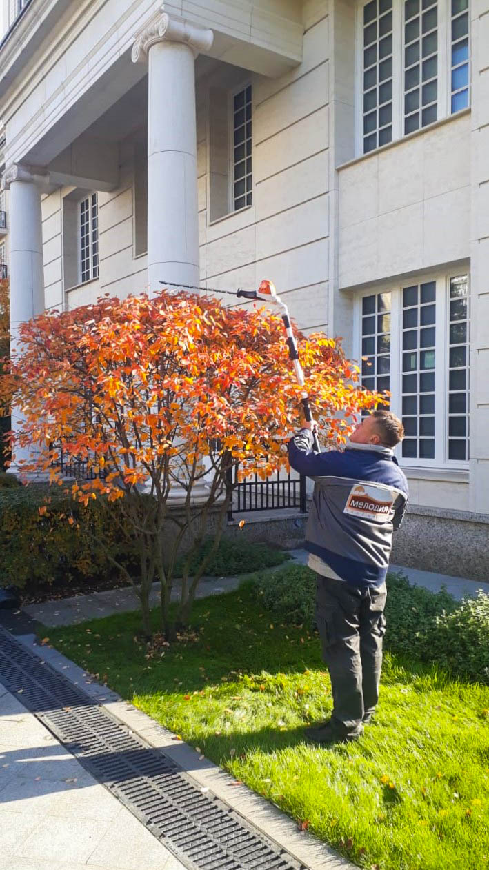 С мая по октябрь выполняем регулярные работы по участку: стрижка и подкормка газона, формовочная стрижка растений, рыхление приствольных лунок, прополка цветников, мониторинг влажности и корректировка полива с учетом охвата всех зон.